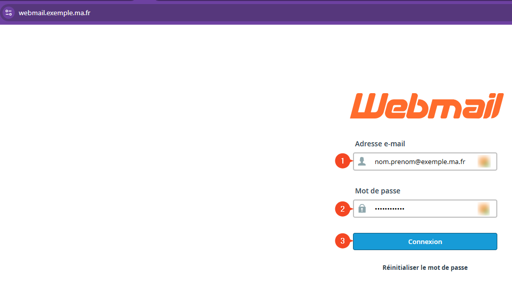 1. Connectez-vous à votre espace Webmail (dans notre exemple, via le lien https://webmail.exemple.ma.fr/). Dans votre cas, “exemple.ma.fr” sera remplacé par votre nom de domaine.