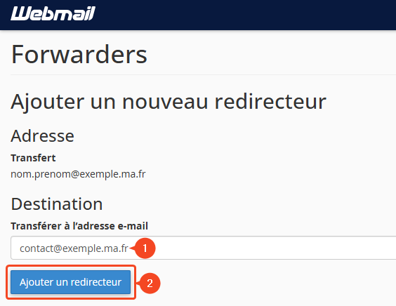 Dans l’exemple ci-dessus, nous choisissons de rediriger tous les e-mails qui sont envoyés vers “nom.prenom@exemple.ma.fr” vers l’adresse contact@exemple.ma.fr.