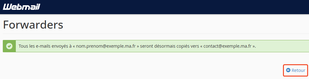5. Désormais tous les messages envoyés vers votre adresse e-mail principale transiteront par votre alias de compte e-mail. En cliquant sur “Retour”, vous reviendrez sur l’accueil de vogtre Webmail.