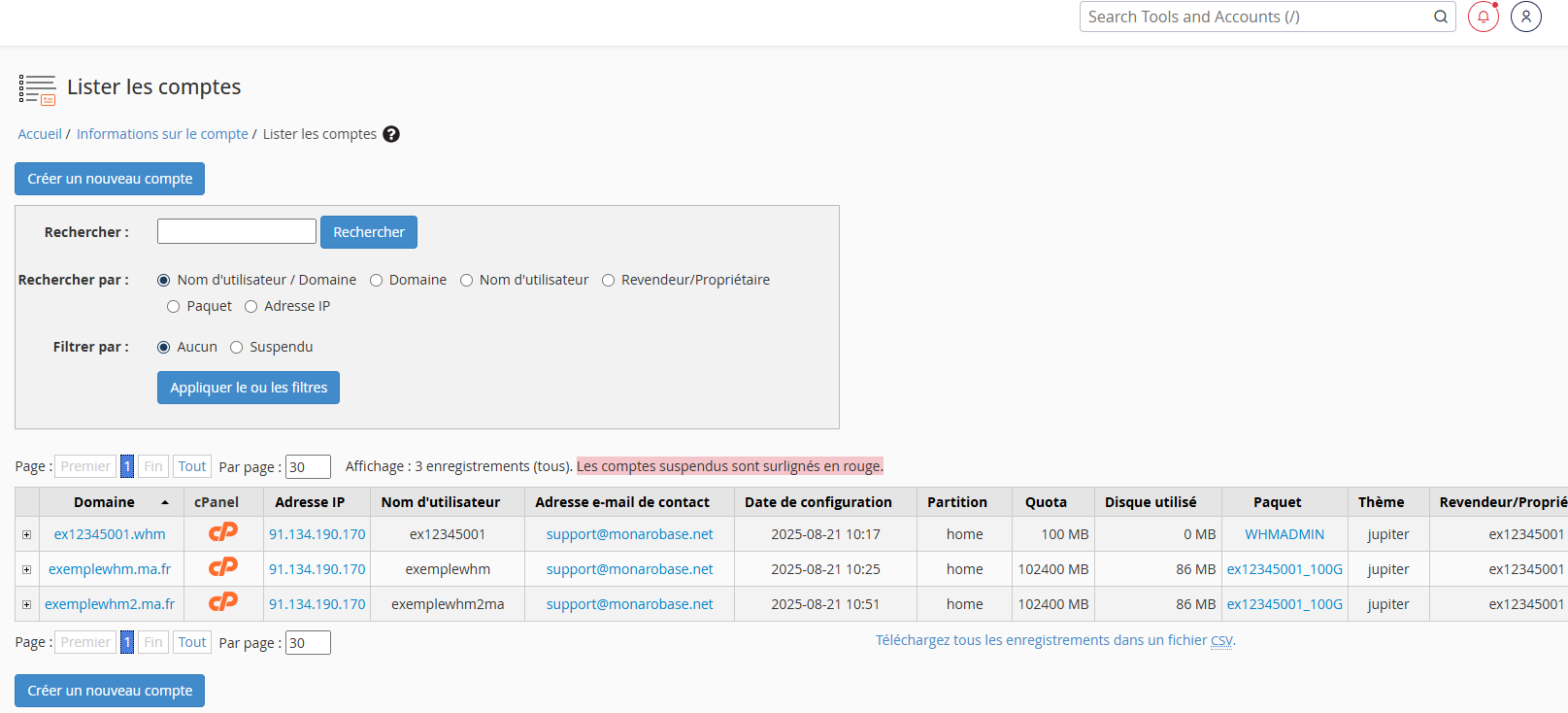 - Gérer l’activation ou l’éventuelle suspension de chaque compte cPanel,