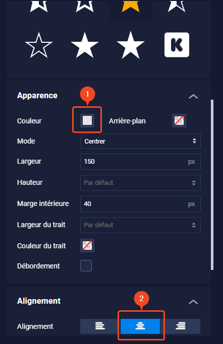 Nous en avons profité pour modifier la couleur d’origine de cette étoile et la centrer parfaitement par rapport au titre en cliquant sur le petit carré situé à droite de la mention “Couleur” et en cliquant sur l’icône permettant de la centrer :