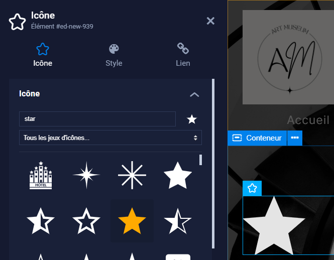 L’icône souhaitée est une étoile. Nous allons donc saisir “star” dans le moteur de recherche interne de SiteJet Builder : cela permettra de choisir quel design d’étoile intégrer au-dessus de notre titre :